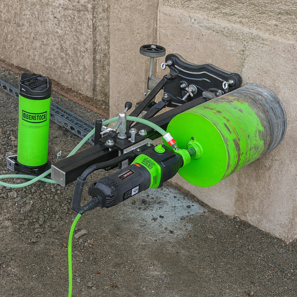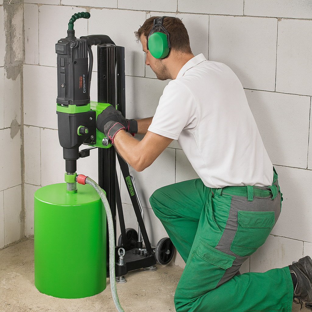 Jádrová vrtačka Eibenstock DBE 352 je profesionální stroj určený pro mokré vrtání do betonu, železobetonu, zdiva i kamene. Díky výkonnému motoru 3 000 W a třírychlostní převodovce (230 / 500 / 1 030 ot./min) si snadno poradí s různými průměry korunek – od menších otvorů do 100 mm až po velké průměry do 352 mm.