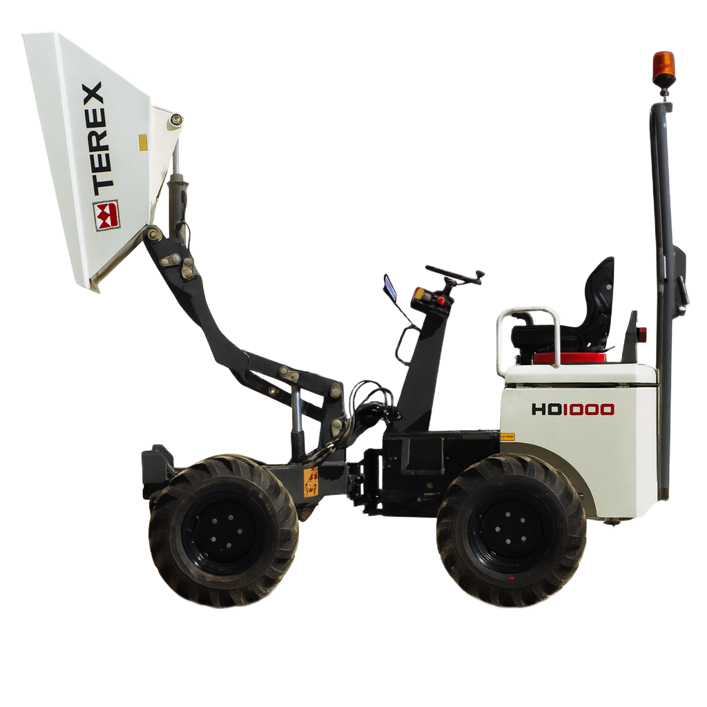 Stroj je vybaven spolehlivým dieselovým motorem Kubota D905 o výkonu 16,4 kW (22 HP), který zajišťuje nízkou spotřebu a dlouhou životnost. Maximální rychlost až 11 km/h umožňuje rychlé přesuny na stavbě a efektivní využití času. Terex HD1000 je navíc vybaven ochranným rámem ROPS, který výrazně zvyšuje bezpečnost obsluhy při práci v nerovném terénu a v případě převrácení stroje. Robustní konstrukce společně s bezpečnostními prvky zaručují spolehlivý a bezpečný provoz