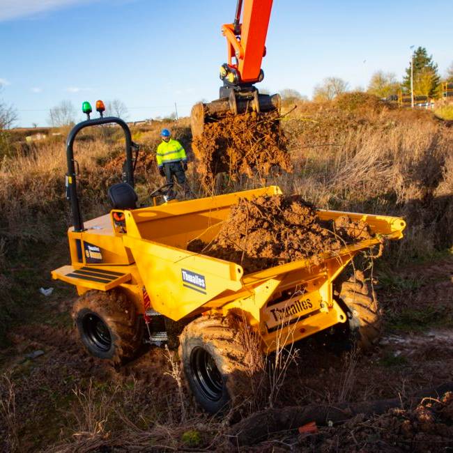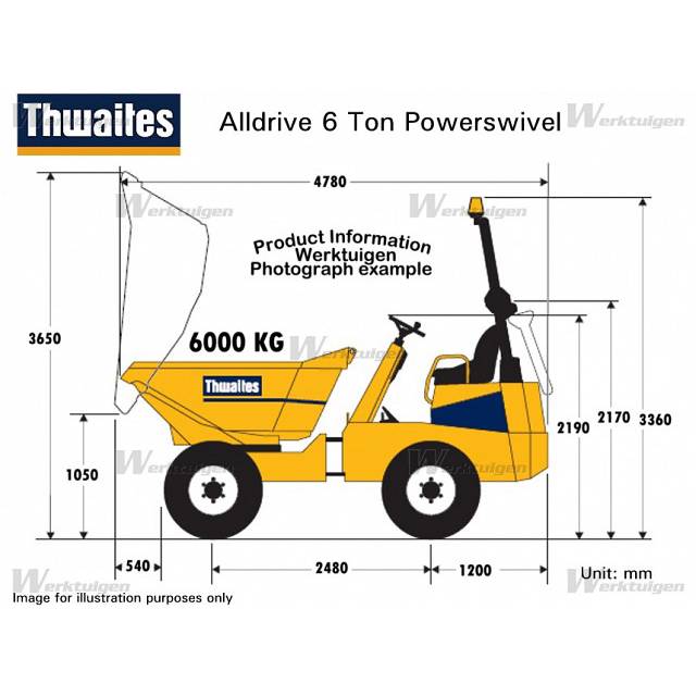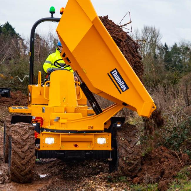 Dumper je vybaven otočnou korbou (swivel skip), která umožňuje výsyp nejen vpřed, ale i do stran, což výrazně usnadňuje práci v uzavřených nebo liniových úsecích. Díky jednoduchému ovládání, pevné konstrukci a vysoké průchodnosti je stroj spolehlivým pomocníkem i ve ztížených podmínkách.